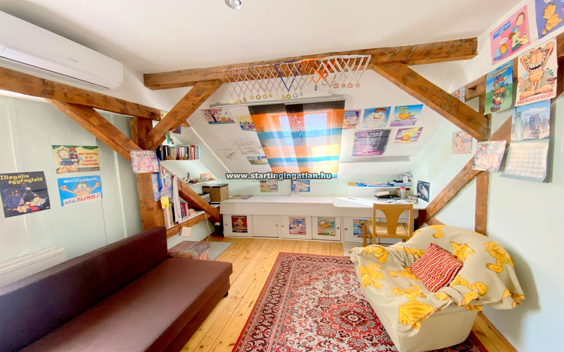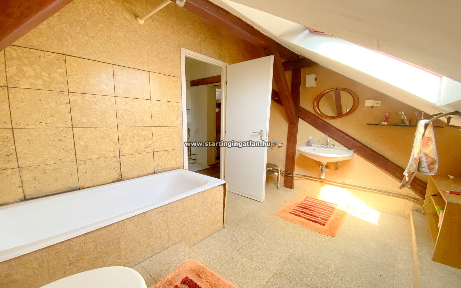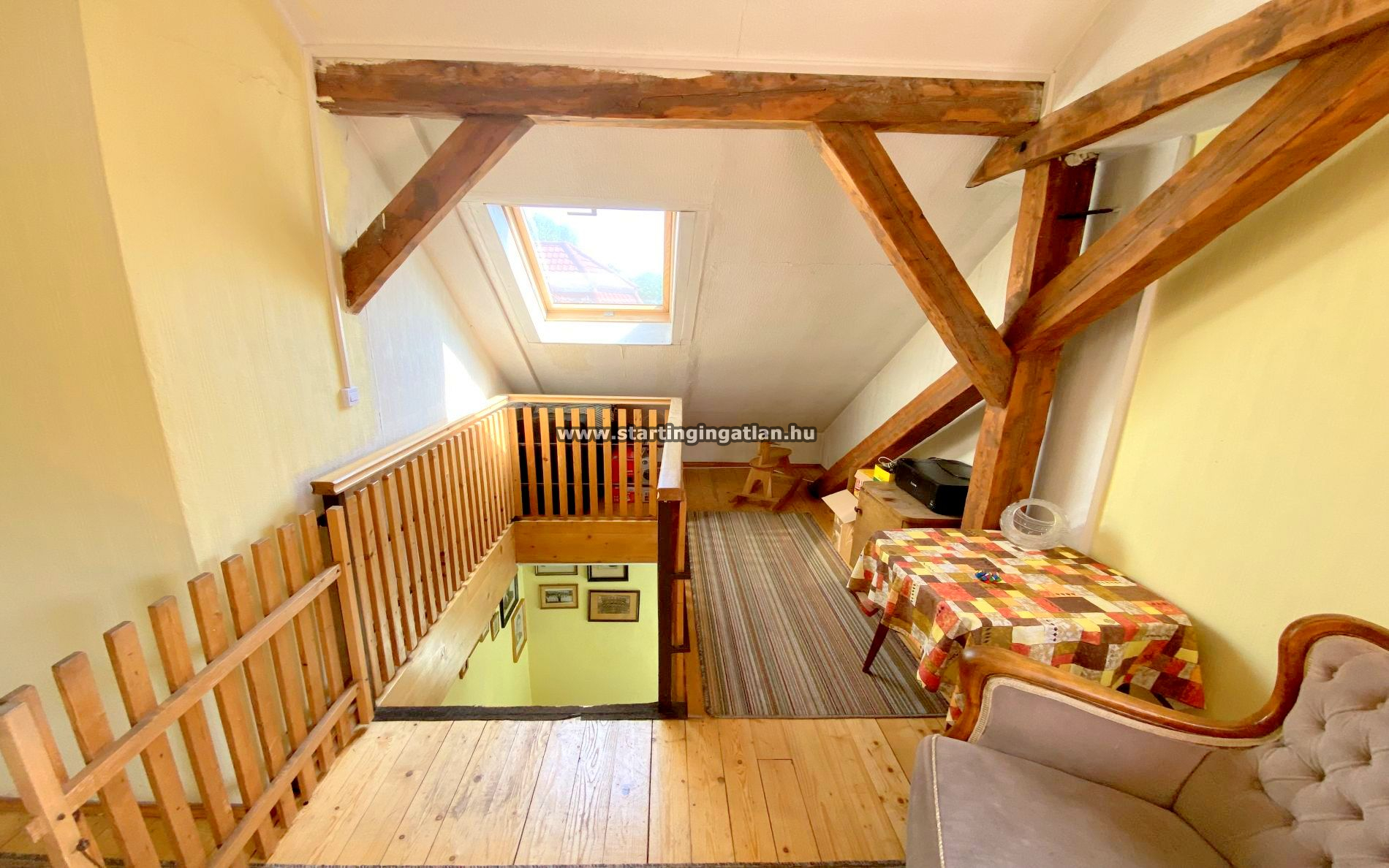 A tetőtéri szinten három külön nyíló szoba, egy kádas fürdőszoba, valamint egy konyhának előkészített helyiség található. Az emeleti komfortot tovább növeli egy modern, hűtő-fűtő klíma, amely a forró nyári napokon és a hűvösebb időszakban is kellemes hőérzetet biztosít.
